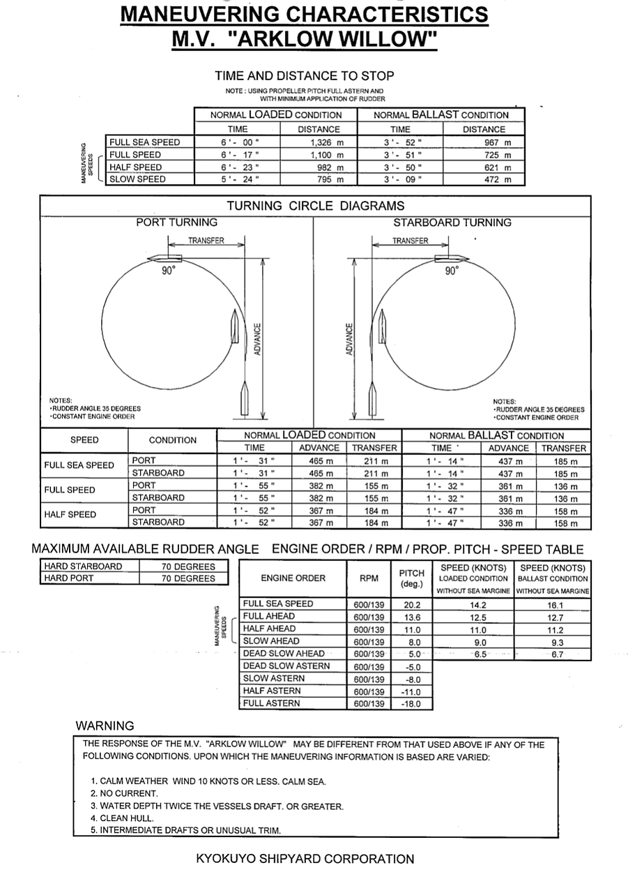 La manœuvre est un aspect clé de la navigation sécuritaire, surtout dans des eaux restreintes. Il est donc important que les membres de l’équipe à la passerelle aient de l’information sur tout facteur pouvant influer sur le système de gouverne d’un navire. Cette information peut être donnée de diverses façons, notamment sur des affiches, dans les caractéristiques de manœuvre du navire et dans la fiche de pilotage du navire.