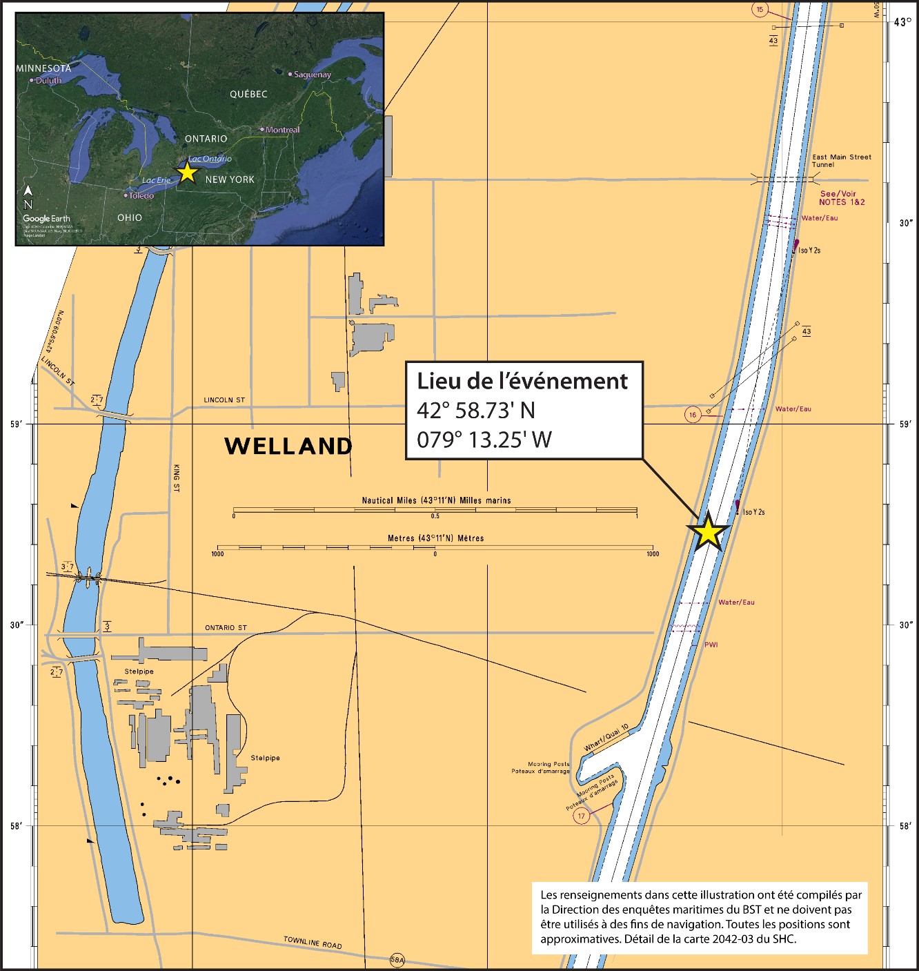 Le 9 juillet 2020, l’Alanis a quitté Montréal (Québec), au Canada, à destination de Duluth (Minnesota), aux États-Unis. Le 11 juillet à 0 h 55Footnote 8, l’Alanis est arrivé à l’écluse 1 du canal Welland. En raison d’une accumulation de traficFootnote 9 dans le canal, l’Alanis est resté immobilisé à l’écluse 1 jusqu’à 7 h 20, heure à laquelle le navire a pu commencer à remonter le canal. Vers 13 h 30, l’Alanis a quitté l’écluse 7. L’équipe à la passerelle de l’Alanis était alors composée d’un pilote de l’Administration de pilotage des Grands Lacs (APGL), d’un timonier et du second officier, qui était l’officier de quart.