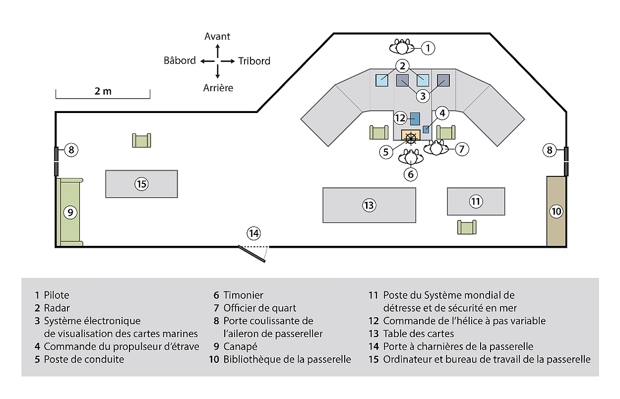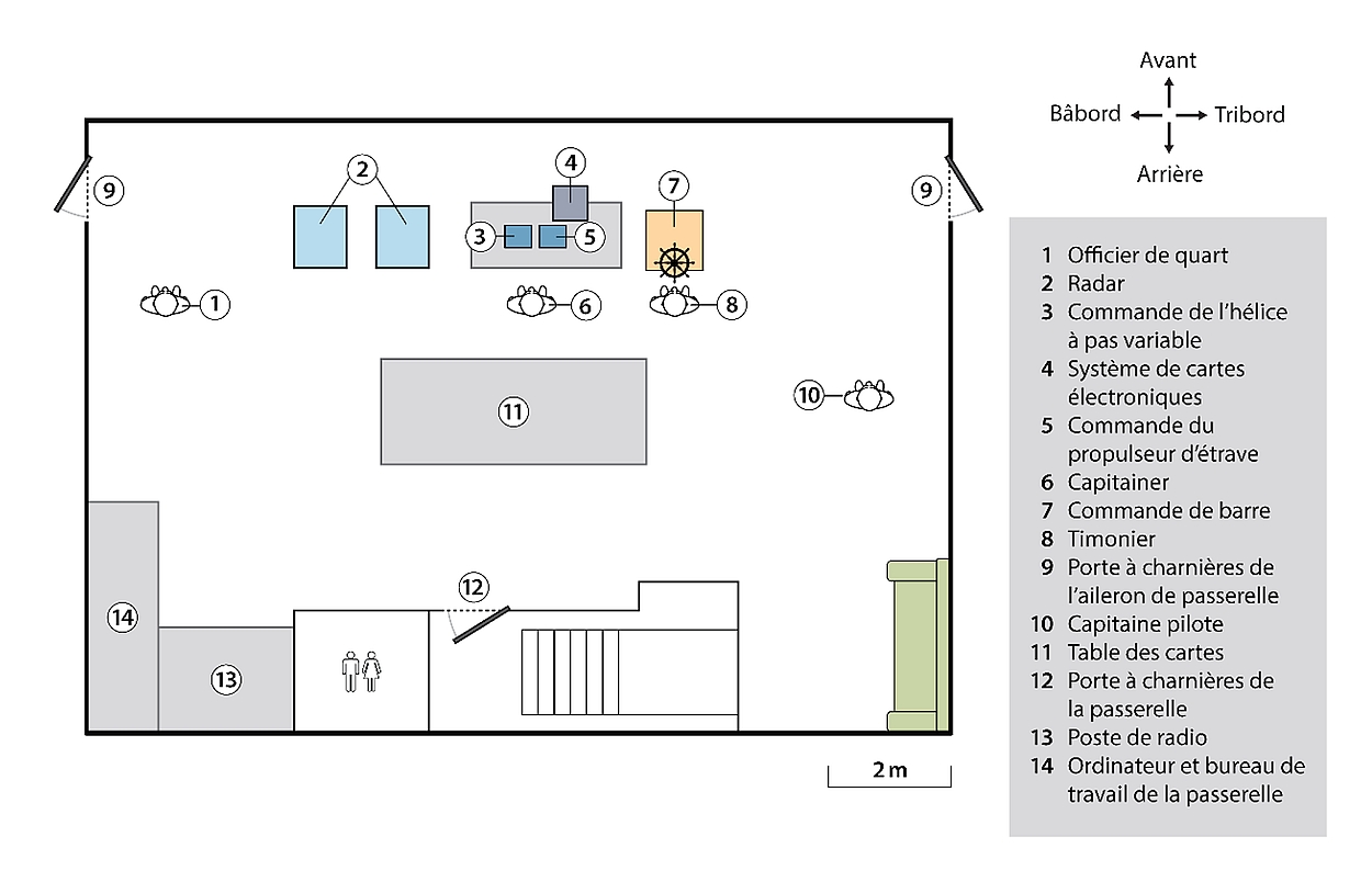 La passerelle comporte tous les instruments de navigation requis, y compris une console de navigation qui contient le poste de conduite, les commandes de propulsion, des radars de 3 cm et de 10 cm et un système électronique de visualisation des cartes marines (ECDIS) (figure 4). Le navire est doté d’un DGPS et d’un SIA. Un enregistreur de données de voyage est également installé à bord.