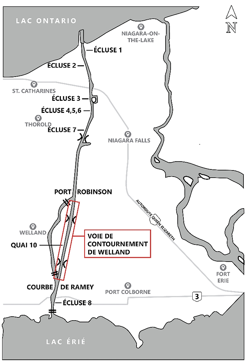 La CGVMSL dispose d’un manuel qui établit des limites de vitesse pour les différentes parties de la Voie maritime. La limite de vitesse sur le canal Welland est de 6 nœuds, à l’exception de la voie de contournement de Welland, où la limite de vitesse est de 8 nœuds Footnote 6, Footnote 7. La voie de contournement de Welland est une section du canal relativement droite de 13,4 km entre Port Robinson et Ramey’s Bend (figure 5). La voie de contournement a une largeur navigable de 106,7 m et une profondeur d’eau de 9,1 m. Les navires sont autorisés à se rencontrer dans la voie de contournement de Welland.
