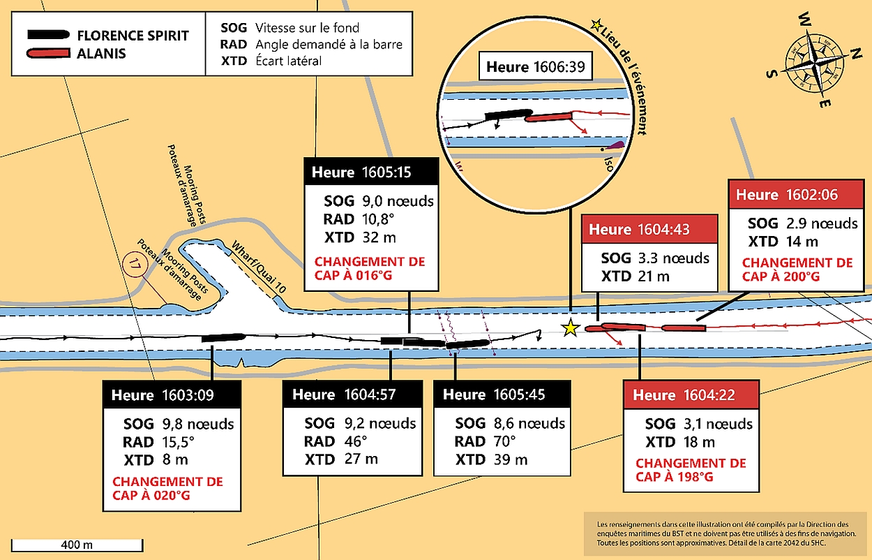 - Après que le Florence Spirit a modifié sa trajectoire de 4° pour refléter les changements de cap de l’Alanis, il a maintenu une trajectoire qui l’a mené près de la berge à une vitesse élevée, ce qui a accru les effets hydrodynamiques agissant sur le navire.