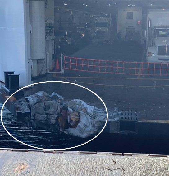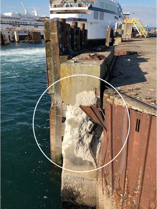 Le navire a subi des dommages à la tôle de pont, au liston et au coqueron avant au-dessus de la ligne de flottaison (figure 2). La culée en béton du mur du poste d’accostage a également été endommagée (figure 3). Le navire a accosté au poste d’accostage 3 à 16 h 37. Les véhicules sur le pont-garage supérieur et les passagers à pied ont débarqué à 18 h 02, et les autres véhicules sur le pont-garage principal ont débarqué à 20 h 58.