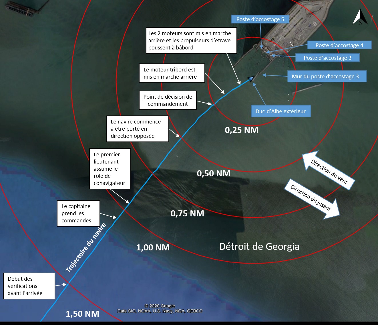 Pour contrer les effets du vent et de la marée, le navire s’est approché en s’alignant sur le poste d’accostage 5, situé à gauche du poste d’accostage 3. Le capitaine a ensuite donné l’ordre au timonier d’ajuster le cap à tribord et d’aligner le navire sur l’extrémité du Spirit of British Columbia, qui était amarré au poste d’accostage 4. Puis, le capitaine a donné l’ordre au timonier de réajuster le cap à tribord et de s’aligner sur le milieu du poste d’accostage 3.