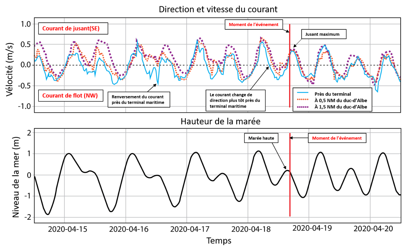 La figure 5 présente la reconstitution par le modèle de la direction et de la vitesse des courants (graphique supérieur) en corrélation avec la hauteur de la marée (graphique inférieur), jusqu’au moment de l’événement. Le modèle fait état de courants ordinaires au moment de l’événement; selon le modèle, le courant était à son jusant maximum et, le courant près du terminal maritime (ligne pleine, graphique supérieur) étant semblable à celui que l’on retrouvait plus loin dans le canal, il n’y a eu aucun renversement du courant. Le courant à proximité du terminal maritime change généralement de descendant à montant un peu avant le courant plus loin du terminal (ligne pointillée et ligne de carrés, graphique supérieur), mais cela se produit lorsque les courants approchent de zéro (étale de courant), pas immédiatement après le jusant maximum.