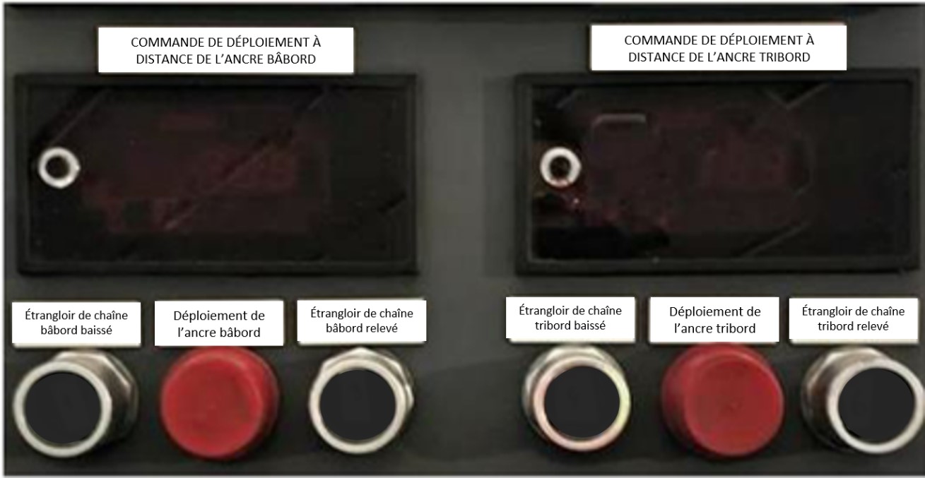 Le processus de déploiement d’une ancre à distance comprend 2 étapes. Tout d’abord, il faut appuyer sur le bouton CHAIN STOPPER UP [étrangloir de chaîne relevé], qui relève l’étrangloir de chaîne qui immobilise l’ancre pendant la navigation. Ensuite, il faut appuyer sur le bouton ANCHOR RELEASE [déploiement de l’ancre] et le maintenir enfoncé jusqu’à ce que l’ancre se libère et que la longueur voulue de chaîne soit filéeNote de bas de page 15. Il y a un décalage de 4 à 6 secondes avant que l’ancre ne commence à se déployer, pendant lequel le frein du guideau se desserre à distance. Au moment de l’événement, il n’y avait pas d’étiquettes ni d’instructions sur le panneau de commande pour aviser les utilisateurs de ce décalage.
