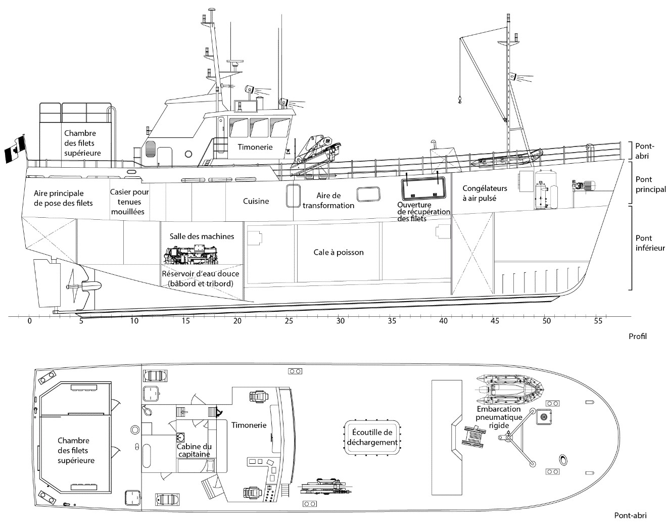 Le Suvak (figure 1) est un chalutier-usine réfrigéré en acier soudé, équipé pour la pêche au filet maillant du flétan du Groenland. Le navire possède 3 ponts : le pont inférieur, le pont principal et le pont-abri (figure 2). La cale à poisson et la salle des machines sont situées sur le pont inférieur. L’usine est située sur le pont principal et inclut une aire de transformation et des congélateurs à air pulsé. L’aire principale de pose des filets est aussi située sur le pont principal. La timonerie et la chambre des filets supérieure sont situées sur le pont-abri.