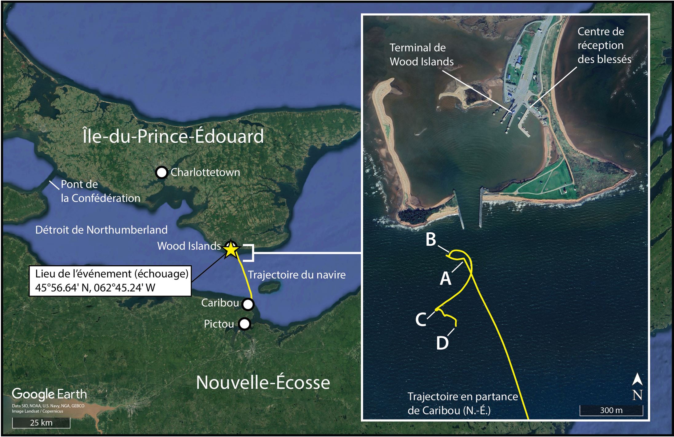 À 11 h 12, le capitaine a échoué le navire sur un banc de sable situé à l’ouest du chenal, à l’extérieur de l’entrée du terminal de Wood Islands.