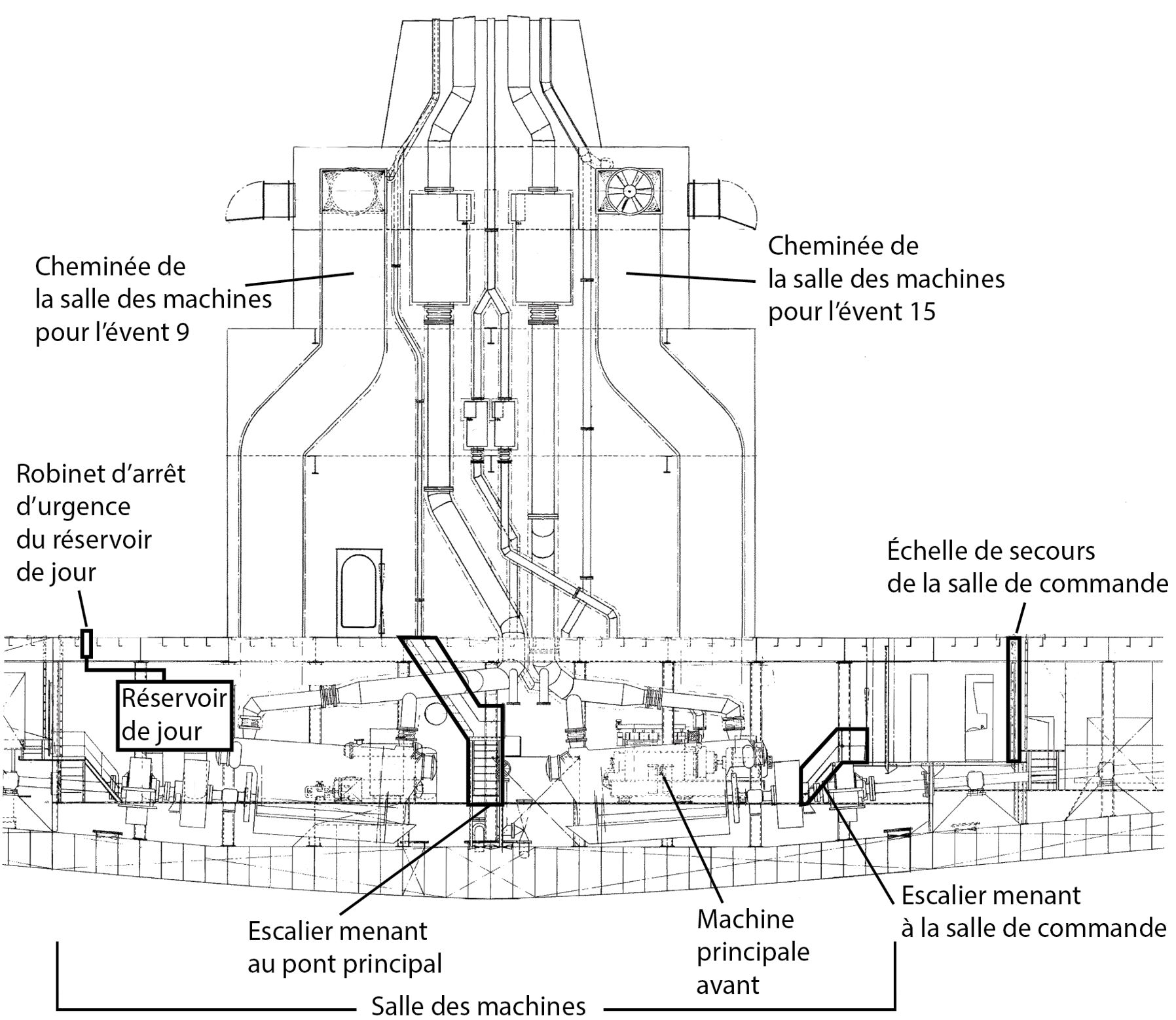 Les aires de pré-embarquement des 2 postes de rassemblement se trouvaient sur le pont des embarcations à l’extérieur de chaque passerelle. Les radeaux de sauvetage, les dispositifs d’évacuation en mer (MES)Un dispositif d’évacuation en mer est un « [é]quipement de sauvetage composé d’un ou de plusieurs radeaux de sauvetage gonflables, d’un toboggan ou d’une glissière permettant d’embarquer dans les radeaux et, dans le cas d’un dispositif composé de plusieurs radeaux, d’une plate-forme de sauvetage gonflable. » (Source : Transports Canada, C.R.C., ch. 1436, Règlement sur l’équipement de sauvetage [modifié le 19 juin 2024], paragraphe 2(1)) et la génératrice de secours se trouvaient également sur le pont des embarcations. Le réservoir de carburant de la génératrice de secours, la salle des ventilateurs et les salles des fournaises se trouvaient sur le pont du rouf supérieur. Le réservoir de carburant de la fournaise des quartiers d’équipage se trouvait sur le pont de cheminée, tout juste au-dessus des salles des ventilateurs et des fournaises.