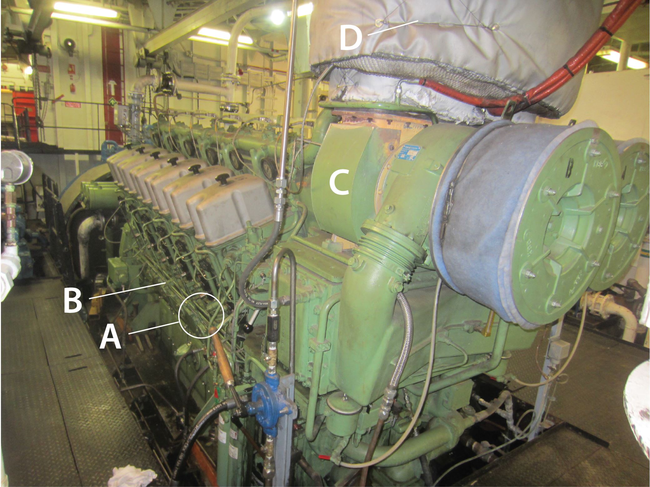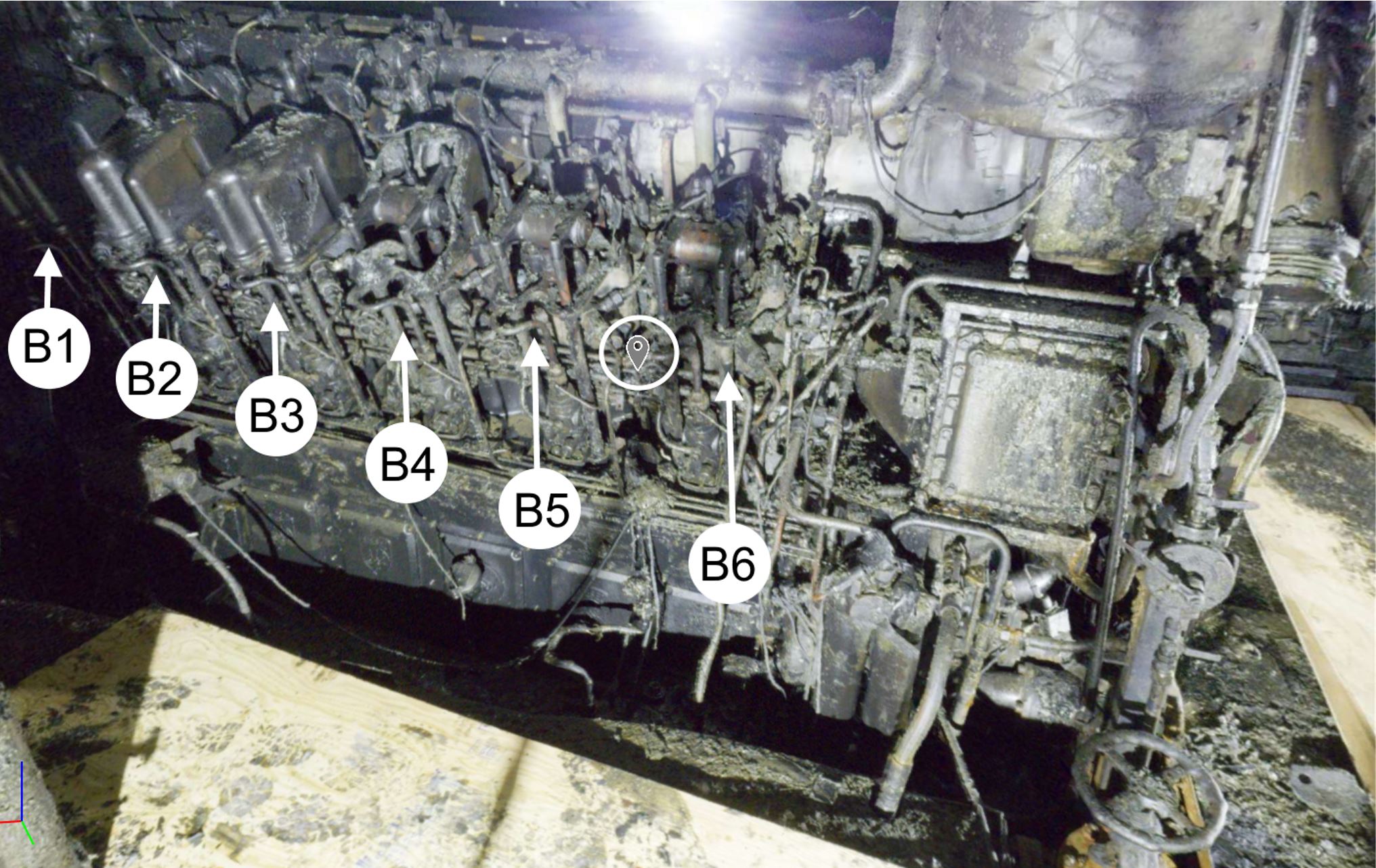 L’enquête a permis de déterminer qu’une série de réparations temporaires avaient été effectuées sur une rampe d’alimentation en carburant qui fuyait au cours d’une période d’environ un mois avant l’événement, à l’aide de matériaux et de méthodes non standards, alors que le navire restait en service. Lorsque la dernière réparation temporaire de la rampe d’alimentation en carburant qui fuyait a échoué, du carburant a été pulvérisé sur les composants chauds du moteur et s’est enflammé.