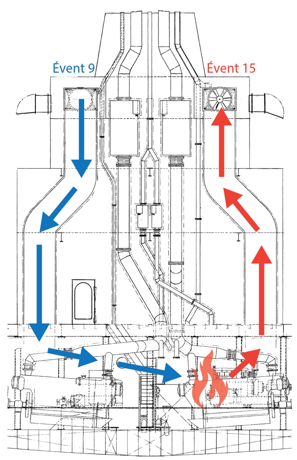 Le matelot de pont 4 est allé fermer les évents d’admission d’air 9 et 15Les évents 9 et 15 sont les évents d’admission d’air de la machine principale. Ils sont restés ouverts pendant toute la durée de l’événement. situés sur le pont du rouf supérieur, qui devaient être fermés de l’intérieur de la salle des ventilateurs. La poignée de l’évent 9 était en position fermée. À l’évent 15, il faisait trop chaud et il y avait trop de fumée dans la salle des ventilateurs pour être en mesure d'y entrer. Le matelot de pont 4 a donc fermé la porte d’un coup de pied de l’extérieur.