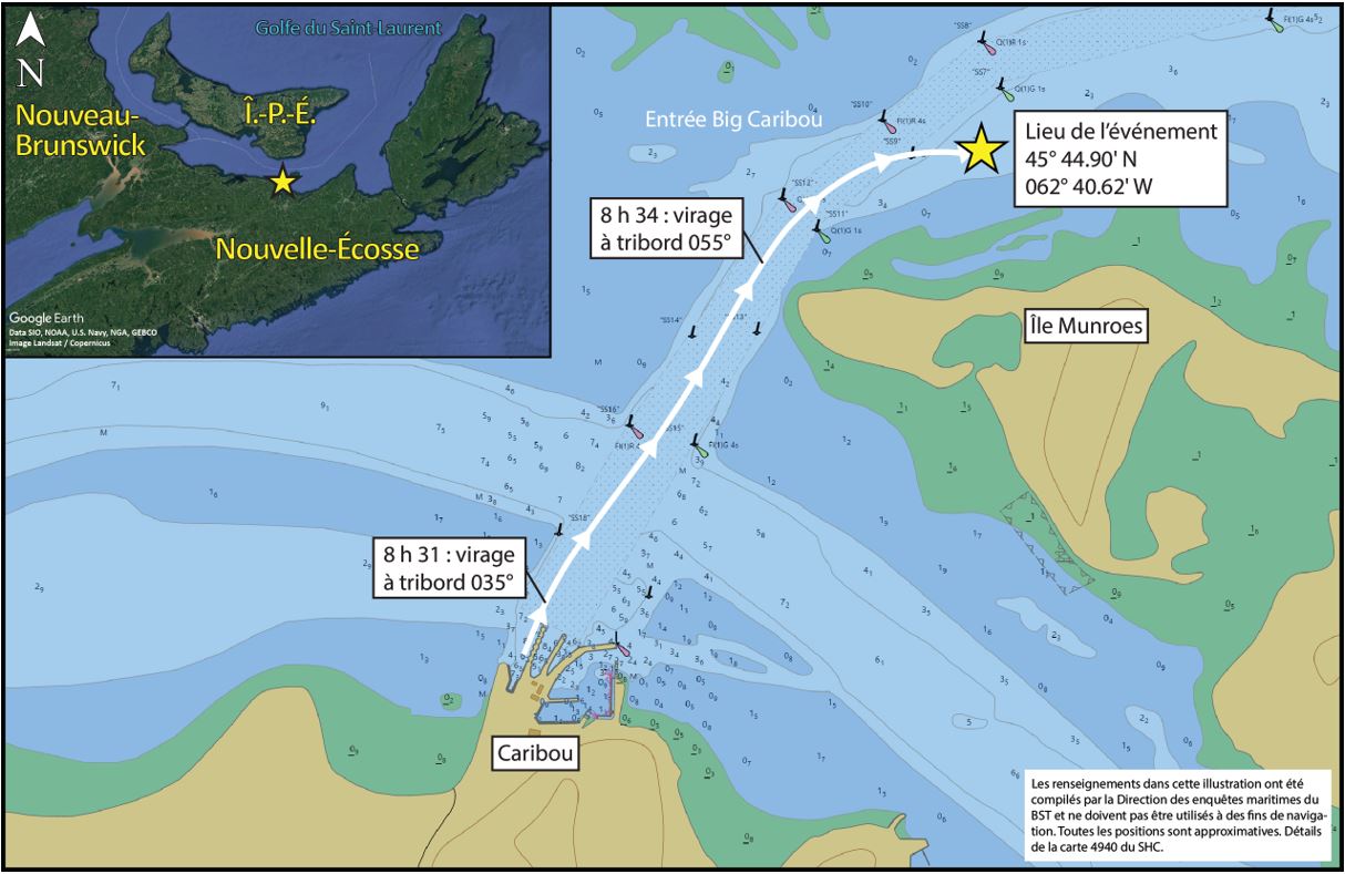 À 8 h 29, avec la marée descendante et une légère brise, le navire a quitté la gare maritime de Caribou, puis a effectué le premier virage à tribord pour sortir du chenal sur un cap de 035 degrés, en augmentant sa vitesse à 11 nœudsNote de bas de page 3. Le quartier-maître gouvernait le navire à partir du poste de gouverne principal faisant face à la proue 2. Le capitaine commandait les hélices et les moteurs à partir du pupitre installé sur l’aileron de passerelle tribord (côté est).
