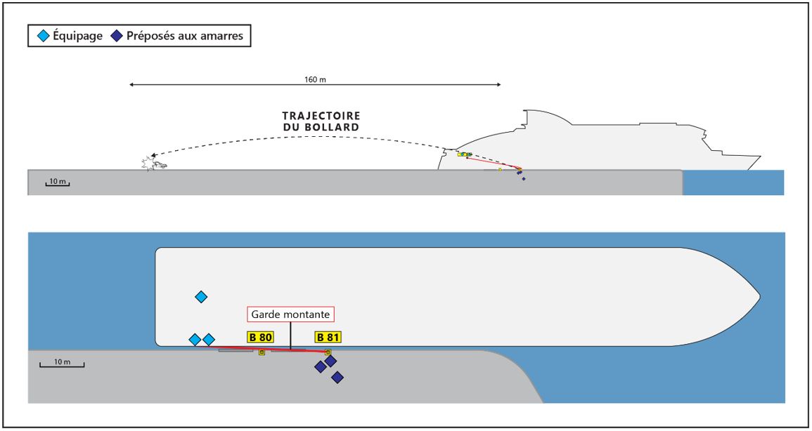 Lorsque la défaillance du treuil est survenue alors que le navire était en mouvement, ni l’opérateur du treuil, ni l’officier n’étaient en mesure de réagir et de corriger la situation. Le bollard d’amarrage B81 a cédé sous la tension de la garde montante, et celle-ci s’est libérée brusquement. L’énergie emmagasinée dans les fibres synthétiques de la garde montante l’a fait rebondir dans un mouvement de coup de fouet vers le haut en direction du poste d’amarrage arrière du Madeleine II.