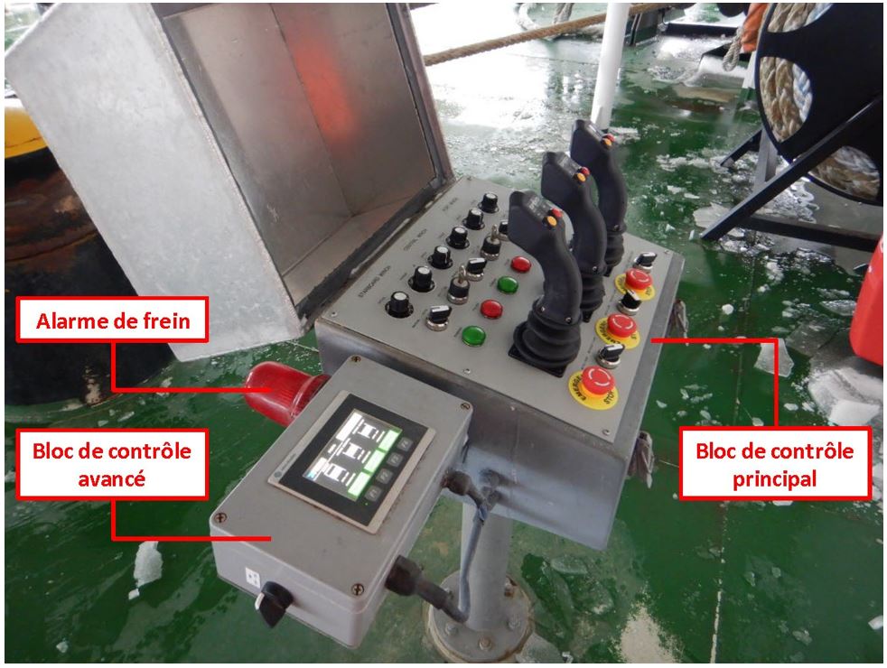 Sur le Madeleine II, plusieurs lacunes liées à la conception du treuil d’amarrage étaient susceptibles de provoquer des erreurs opérationnelles. Par exemple, pour réarmer l’alarme et réactiver le treuil, l’opérateur doit accéder au sous-menu sur l’écran tactile du bloc de contrôle avancé situé à gauche du bloc de contrôle principal. Ensuite, il doit revenir au menu précédent pour reprendre le contrôle du treuil. Une interface ne devrait contenir que les informations et les fonctions nécessaires à l’opérateur pour effectuer sa tâche. Or, l’interface du bloc de contrôle avancé contient de multiples menus et sous-menus non pertinents au travail de l’opérateur, et la fonction dont il a besoin rapidement, la réactivation du treuil, n’est pas directement disponible. De plus, l’interface du bloc de contrôle avancé est en espagnol, une langue qui n’est pas parlée ni comprise par les membres de l’équipage du pont arrière. L’opérateur a donc dû se fier entièrement sur sa mémoire pour choisir la bonne combinaison de menus et de sous-menus afin de réactiver le treuil à l’origine de l’alarme, ce qui a augmenté son temps de réponse. La conception du bloc de contrôle avancé augmente le temps de réponse de l’opérateur et le risque de commettre une erreur en situation critique.