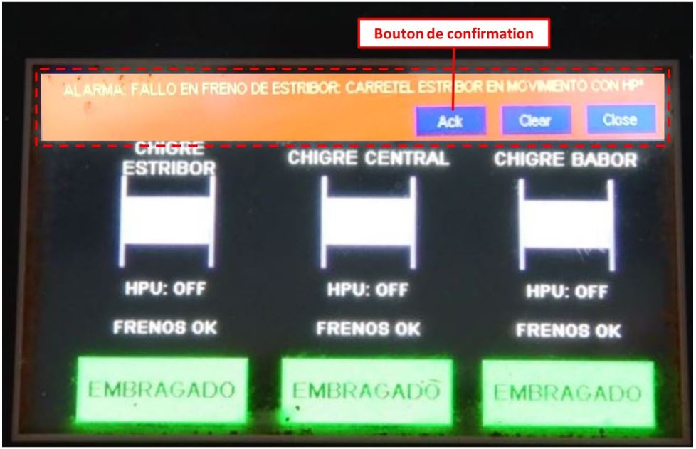 Les treuils ont 2 niveaux d’alarme : le 1er niveau d’alarme avertit l’opérateur qu’une anomalie est survenue par rapport à un des paramètres préétablis dans le système. Cela n’affecte pas le fonctionnement du treuil. Le 2e niveau d’alarme avertit l’opérateur que l’anomalie a atteint sa limite configurée dans le système, et le treuil cesse de fonctionner. Le signal sonore et le signal visuel des 2 niveaux d’alarme sont les mêmes; seul l’opérateur peut les différencier, car il peut voir l’indication de défaillance sur le bloc de contrôle avancé. Comme les signaux sonores et visuels sont identiques, l’officier ne peut pas déterminer le niveau d’alarme sans communiquer avec l’opérateur.