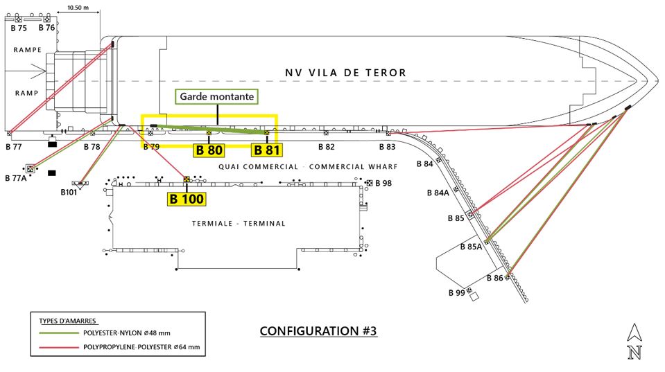 Dans l’amarrage standard d’un navire, des gardes montantes arrière et des amarres de bout avant empêchent le navire de se déplacer vers l’arrière. La géométrie du quai no 2 n’est pas optimale pour l’amarrage du Madeleine II, car approximativement 57 m de l’avant du navire sont en saillie par rapport au quai. Pour cette raison, aucune amarres de bout avant ne peut être déployée et seulement des gardes montantes arrière placées sur les bollards B81 et B100 peuvent empêcher le navire de reculer. Cette méthode d’amarrage ajoute une charge supplémentaire sur les bollards B81 et B100; cette charge est aggravée par des vents forts.