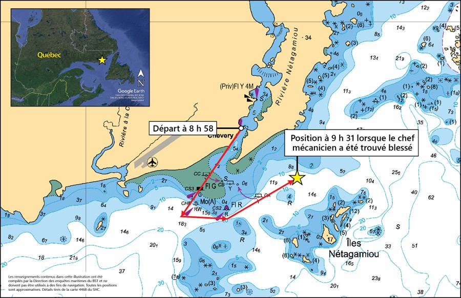 À 9 h 32, le premier officier a quitté la tranche des machines par la porte d’accès du pont principal pour aviser le capitaine des blessures du chef mécanicien et demander de l’aide pour secourir le chef mécanicien. Le capitaine a appelé à l’aide un bateau-taxi, l’Eaux Scintillantes, qui se trouvait à proximité, puis a fait virer le navire pour retourner à Chevery.