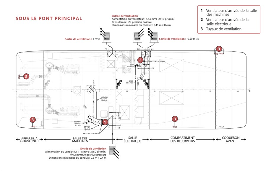 Des registres coupe-feu sont installés dans les conduits d’entrée et de sortie d’air au niveau du pont principal et peuvent être fermés pour couper l’alimentation en air dans la salle des machines et la salle électrique. Les registres coupe-feu peuvent être actionnés à partir du pont principal. Lorsque le navire est hivérisé, des flans spécialement conçus sont installés sur les sorties d’air orientés vers l’extérieur, ce qui permet de garder la tranche des machines au chaud et d’empêcher l’infiltration d’eau.