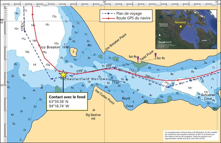 Vers 4 h 50, alors que le navire virait pour sortir du passage Chesterfield (figure 2), une vibration anormale a été ressentie dans tout le navire, et celui-ci s’est mis à répondre plus lentement aux ordres de barre. Peu après, le capitaine a envoyé l’officier de quart dans la salle de contrôle de la cargaison pour vérifier les instruments et s’assurer qu’il n’y avait pas d’infiltration d’eau, et il a amorcé les procédures d’urgence. On a soupçonné que le fond du navire était entré en contact avec un objet submergé non cartographié. Le capitaine a dirigé le navire vers un mouillage proche et a ordonné à l’équipage de se rassembler aux postes de rassemblement.