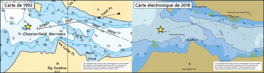 L’édition de 1992 de la carte 5625 indique une profondeur de 4,2 m à la position de l’événement (figure 5). L’édition de 2018 de la carte, qui a été utilisée lors de l’événement, n’indique pas la même faible profondeur à cette position. Six années se sont écoulées entre, d’une part, la réalisation du levé hydrographique utilisé pour l’édition de 2018 de la carte et, d’autre part, l’événement mettant en cause le Kivalliq W.