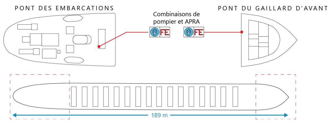Il y avait 4 postes de rassemblement. Ceux-ci étaient situés à l’avant du rouf arrière, sur le pont des embarcations, à l’arrière du rouf avant, sur le pont de gaillard d’avant, dans la salle de commande des machines et sur la passerelle. Les combinaisons de pompier et les appareils de protection respiratoire autonome (APRA) du navire étaient rangés dans des casiers situés dans les postes de rassemblement, des roufs avant et arrière. Chaque casier renfermait 1 combinaison et 1 APRA, avec des bouteilles de rechange.