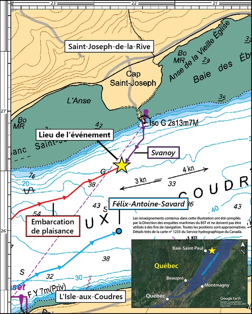 Le matin du 2 juillet 2023, le traversier à passagers Svanoy, chargé de passagers et de véhicules, a quitté le quai de traversier de Saint-Joseph-de-la-Rive (Québec) pour effectuer son itinéraire prévu jusqu’au quai de L’Isle-aux-Coudres (Québec), sur le fleuve Saint-Laurent. La visibilité était réduite en raison d’un brouillard épais. Lorsque le Svanoy se trouvait à 0,35 mille marin au sud-sud-ouest du quai de départ, le capitaine a aperçu une embarcation de plaisance devant le navire. Quelques instants plus tard, le Svanoy et l’embarcation de plaisance sont entrés en collision.