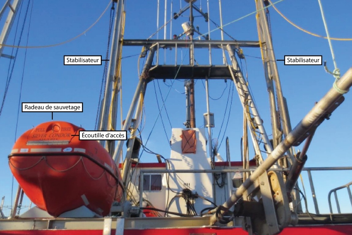 La façon dont le radeau de sauvetage était entreposé l’a probablement empêché de se dégager du bateau lorsque le bateau a coulé par l’arrière. Par conséquent, le radeau de sauvetage était inaccessible à l’équipage lorsqu’il a abandonné le bateau; les membres d’équipage ont alors été exposés aux éléments.