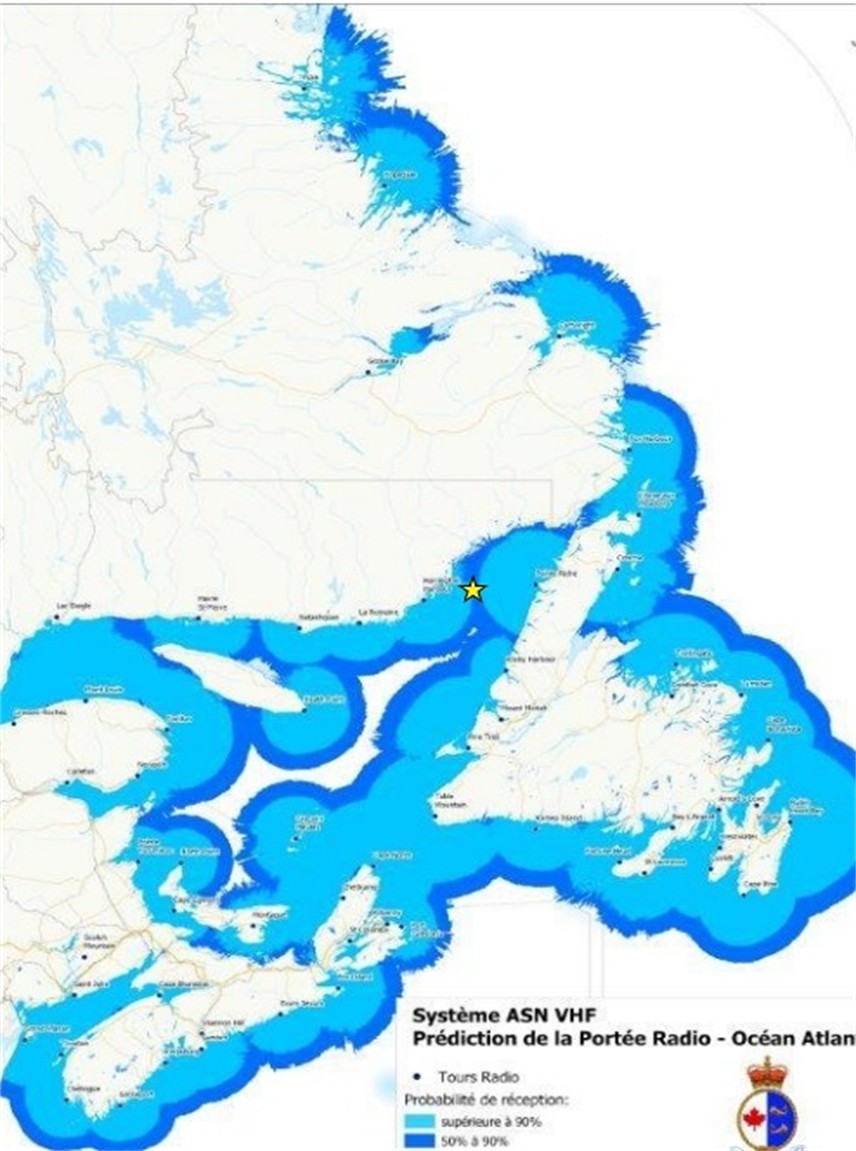 Le guide Aides radio à la navigation maritime indique la couverture radio prévue des stations côtières et des antennes à terre de la Garde côtière canadienne (GCC) le long de la côte atlantique du Canada, qui fait partie de la zone océanique A1. Lorsqu’on tient compte des exigences liées aux radios dont doivent être munis les navires exploités dans le golfe Saint-Laurent, qui est considéré comme une zone océanique A1 aux termes du Règlement de 2020 sur la sécurité de la navigation, et qu’on les compare avec la couverture radio prédite fournie dans le guide Aides radio à la navigation maritime, certains secteurs de cette zone n’ont aucune probabilité calculée de couverture radio VHF des stations côtières, ce qui signifie que les communications entre les stations côtières et les navires dans ces secteurs ne seront pas possibles. Cela signifie également qu’une alerte de détresse émise par radiotéléphone VHF-ASN dans ces secteurs ne sera probablement pas reçue par une station radio côtière.
