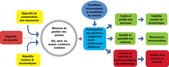 | GESTION DES RESSOURCES HALIEUTIQUES Les pêcheurs sont exposés à des risques quand les mesures de gestion des ressources halieutiques ne prennent pas en compte la sécurité à toutes les étapes, de l'élaboration des politiques à la mise en pratique de celles‑ci. |