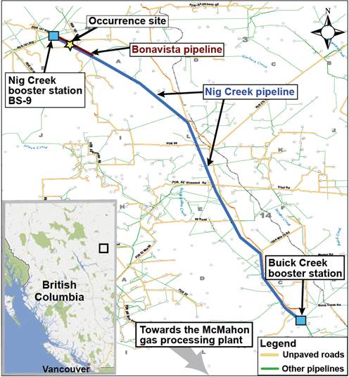 Le 28 juin 2012, à 23h 5, heure normale du Pacifique, le gazoduc de 406,4mm (16po) de Nig Creek, situé à environ 40km au nord-ouest de Buick (Colombie-Britannique) et appartenant à la société Westcoast Energy Inc., s'est rompu et un incendie a suivi. Environ 25 minutes plus tard, le gazoduc de 168, 3mm (6,625po) de la société Bonavista Energy Corporation, installé à proximité dans la même emprise, s'est rompu et un incendie a suivi. Au moment des ruptures, les deux gazoducs étaient hors service et contenaient du gaz acide sous pression. L'incendie s'est propagé aux zones forestières adjacentes. Un cratère de grande dimension a été créé et une section de conduite du gazoduc de Nig Creek ainsi que des débris ont été projetés à environ 20m du point de rupture. Personne n'a été blessé et aucune évacuation n'a été nécessaire.