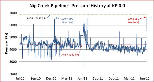 Pendant ces 2 années, la pression de service moyenne à l'intérieur du gazoduc de Nig Creek s'est établie à 4350kPa. À quelques reprises, la pression de service a fluctué pendant de courtes périodes, généralement de 24 à 48 heures. Avant juin 2012, la pression de service maximale enregistrée avait atteint 6628 kPa, le 18 janvier 2011. Les fluctuations de la pression dans ce gazoduc sont généralement provoquées par des facteurs d'exploitation (p. ex., disponibilité du gaz, activités d'entretien et mise hors service de l'usine de traitement du gaz).