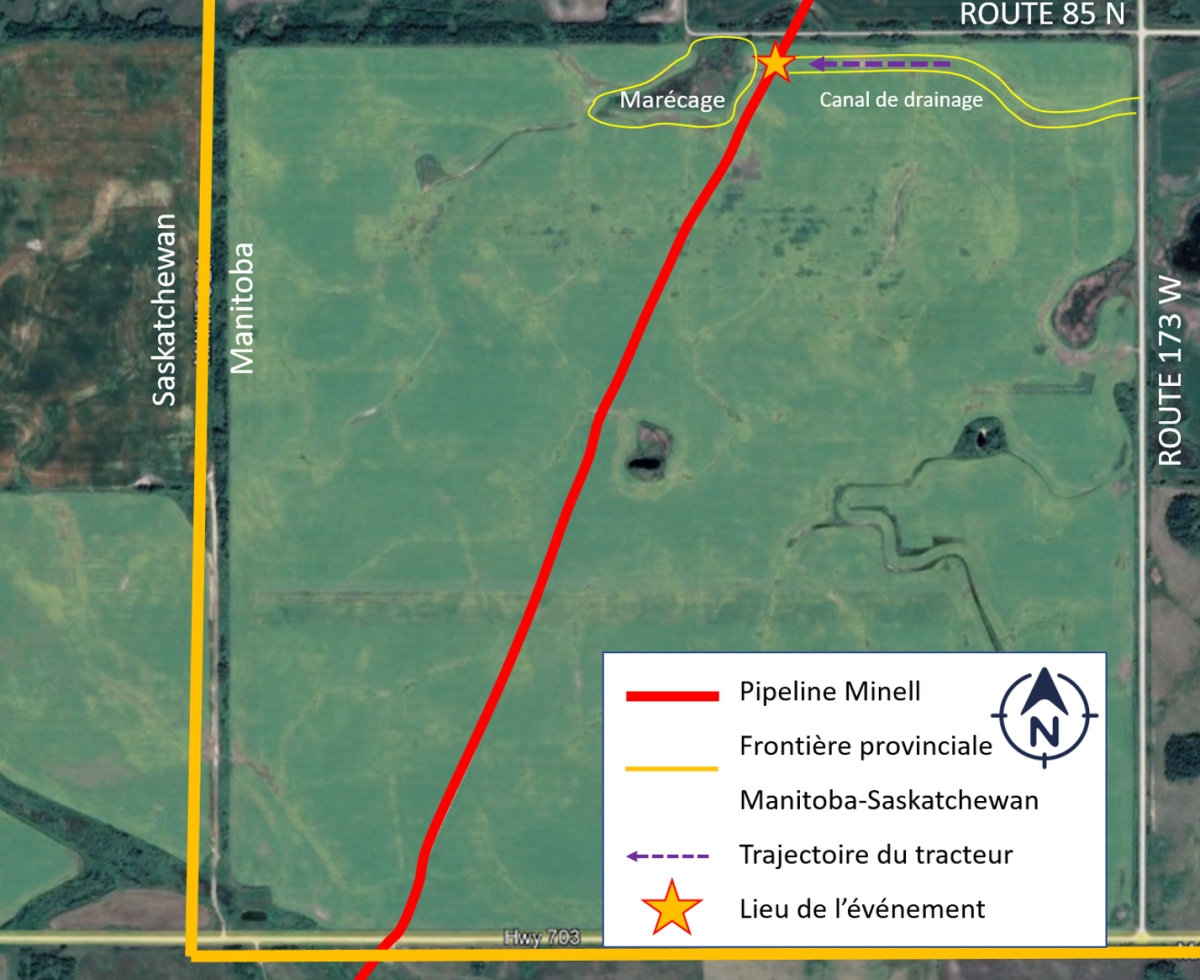 Le pipeline Minell traverse le champ agricole du sud au nord. À l’extrémité nord, on trouve un point d’accès au terrain à l’intersection entre l’emprise du pipeline Minell et la route 85 N. Le point d’accès, qui est indiqué par un panneau d’avertissement de Manitoba Hydro, se trouve à 55 m au nord du lieu de l’événement.