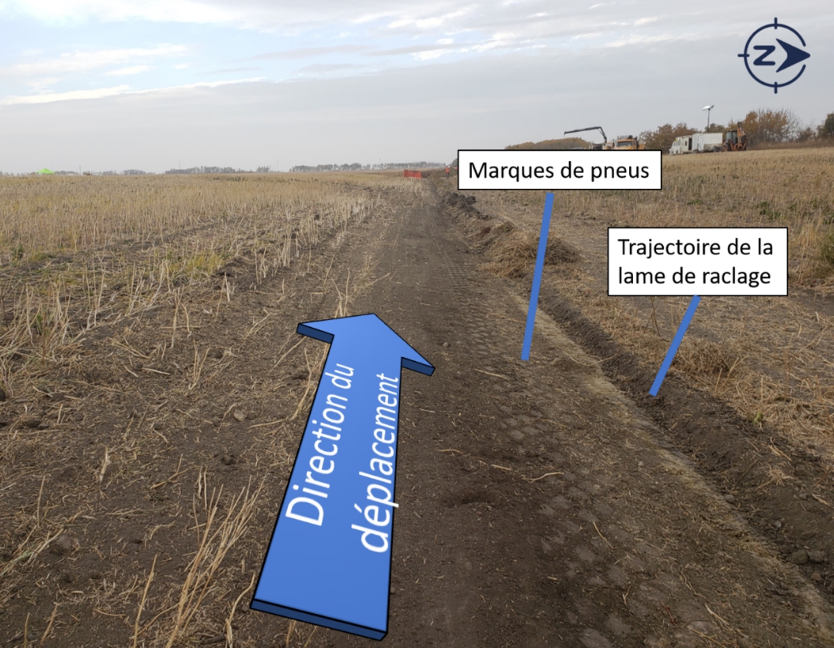 Dans les environs de l’événement à l’étude, le terrain était essentiellement plat et il y avait des restes de tiges de canola récoltées au niveau du solNote de bas de page 8. La trajectoire du tracteur et de la lame de raclage du sol était indiquée par des marques de pneus et par un sol remué là où la lame avait raclé la surface (figure 3). Le raclage du sol a suivi la trajectoire du canal de drainage vers l’ouest, en direction du pipeline et au-dessus de celui-ci, parallèlement à la route 85 N.