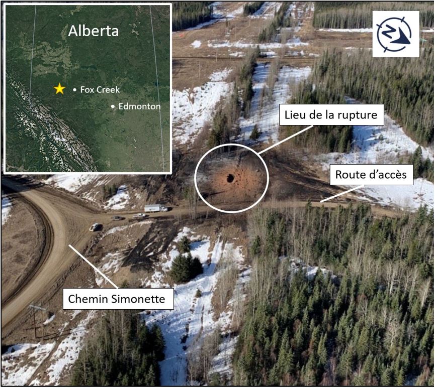 Le 7 avril 2022, vers 3 h 23, heure avancée des Rocheuses, un gazoduc de 8 po (219,1 mm) exploité par NOVA Gas Transmission Ltd. et transportant du gaz naturel non corrosif s’est rompu à environ 64 km à l’ouest de Fox Creek (Alberta). À la suite de la rupture, le gaz naturel s’est enflammé, ce qui a provoqué un incendie. Environ 3 750 000 m3 de gaz naturel ont été rejetés. L’incendie, qui a duré environ 4 heures, a brûlé une superficie de 12 000 m2. Il n’y a eu aucun blessé, et aucune évacuation n’a été requise.