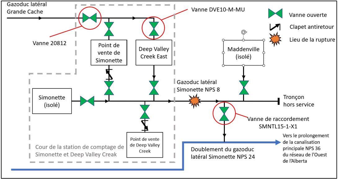 À 3 h 53, après avoir analysé les données du système SCADA, le personnel du centre de contrôle de Calgary a communiqué avec la planificatrice de garde chargée des opérations pour demander un plan d’isolement du gazoduc, qui a été reçu à 5 h 28 Note de bas de page 6. Selon ce plan, l’isolement du tronçon rompu nécessitait la fermeture manuelle de 2 vannes Note de bas de page 7 : la vanne 20812, située dans la cour de la station de comptage de Deep Valley Creek East, et la vanne de raccordement SMNTL15-1-X1 reliant le gazoduc latéral Simonette NPS 8 au doublement parallèle du gazoduc latéral Simonette NPS 24 (figure 2).