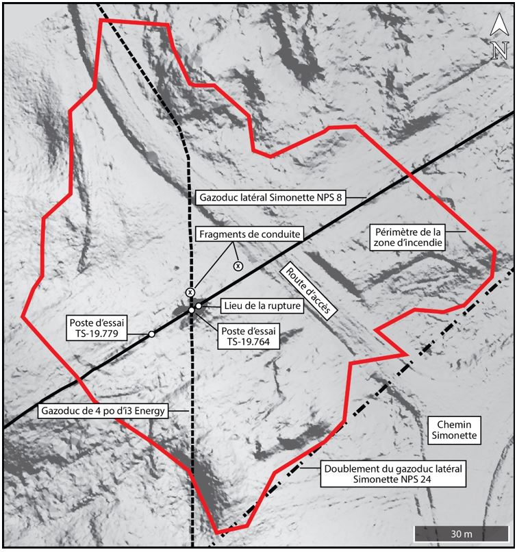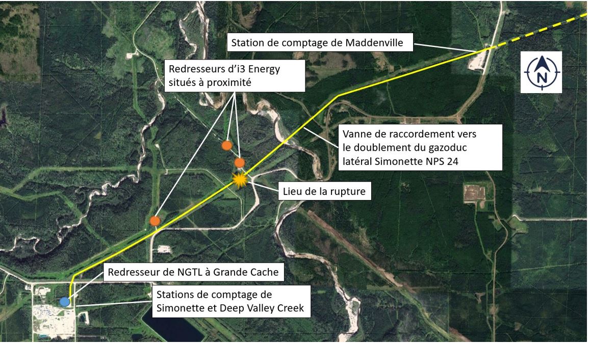 Le gazoduc latéral Simonette d’un diamètre nominal de 8 po (NPS 8) de NOVA Gas Transmission Ltd. (NGTL) s’est rompu près du poste d’essai TS-19.764, à un croisement avec un gazoduc hors service de 4 po appartenant à i3 Energy Canada Ltd. (i3 Energy). Le gaz qui s’est échappé s’est enflammé et a brûlé pendant environ 4 heures.