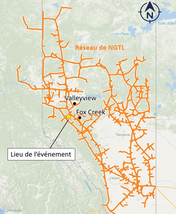 L’événement s’est produit sur des terres publiques dans le district municipal de Greenview (Alberta), sur une emprise utilisée par NGTL. Les 2 villes les plus proches, Fox Creek et Valleyview (Alberta), sont situées à environ 64 km à l’est et 75 km au nord-est, respectivement Note de bas de page 3.