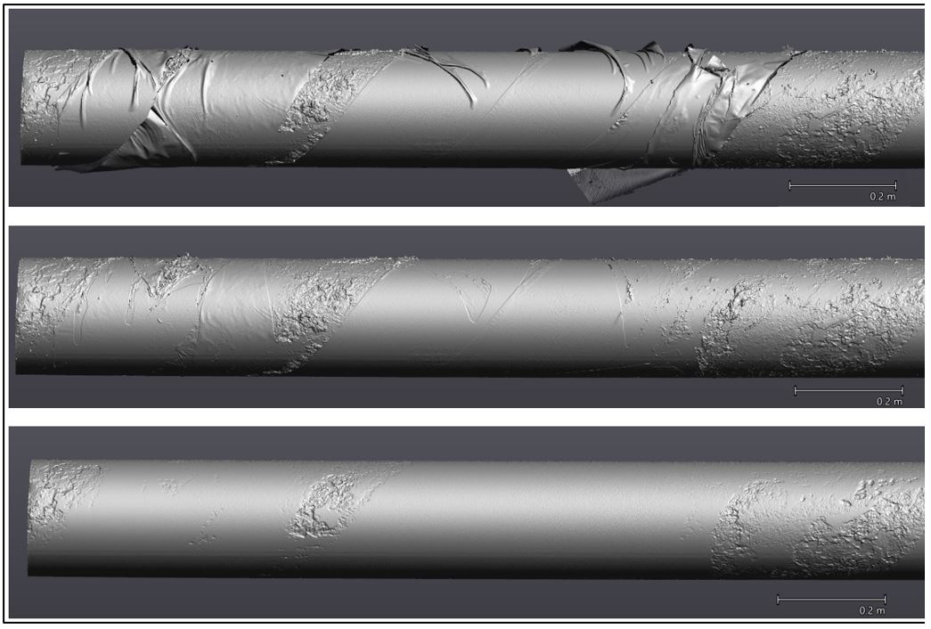 Lors de l’examen en laboratoire de l’état de la surface externe de la conduite, 3 étapes de balayage laser tridimensionnel ont été exécutées. Le premier balayage a été effectué avec le revêtement de ruban encore en place, suivi d’un balayage où le ruban décollé a été enlevé. Un dernier balayage a été effectué après que la conduite a été passée au jet de sable pour enlever tout le revêtement de ruban restant et révéler la surface corrodée de la conduite.