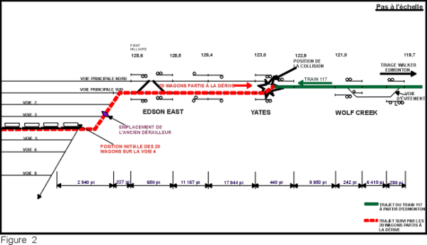 Le schéma de la figure 2 montre les voies ferrées les plus directement visées par l'accident. Il retrace le parcours des wagons partis à la dérive depuis la voie 4 du triage Edson jusqu'au point milliaire 122,9 (le point d'impact) de la subdivision Edson. Il montre également le parcours suivi par le train 117 à partir du triage Walker d'Edmonton ouest jusqu'au point d'impact, près de Yates.