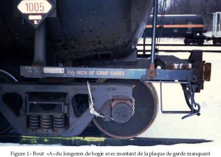 Vers 15 hNote de bas de page 1 le 30 janvier 1997, au point milliaire 117,9 de la subdivision Kingston, un agent de train du Canadien National (CN) à bord du train de marchandises no 590 du CN (train 590) remarque, pendant une manoeuvre à Maitland (Ontario), qu'un montant de la plaque de garde de l'extrémité « A » du longeron de bogie (position R-4) manque sur le wagon-citerne PROX 88181 (le wagon-citerne). On immobilise le train et l'équipe de train examine le wagon-citerne. Le chef de train demande au mécanicien de ramener le train 590 au triage de Brockville à Brockville (Ontario) à vitesse réduite (20 mi/h). À l'arrivée à Brockville, on déclare le wagon-citerne avarié et un préposé aux wagons enchaîne l'essieu au longeron de bogie afin que le wagon-citerne puisse être manoeuvré dans le triage et amené sur la voie de réparation (Figure 1).