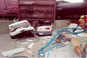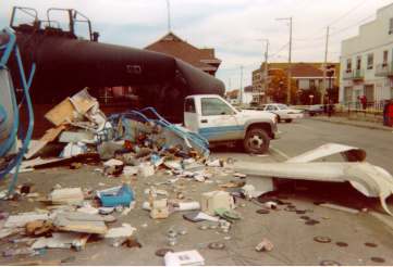 Des résidus de contenu d'un wagon-citerne qui a été broyé et éventré lors de la collision se sont déversés dans l'aire de stationnement et dans la rue. Un camion d'Air Liquide Canada Inc. qui transportait des bouteilles de gaz comprimé a été écrasé (voir la figure 1). Les employés qui se trouvaient dans les environs de la gare ont quitté les lieux immédiatement. Les services de police et des incendies ont établi un périmètre de sécurité autour du lieu de l'accident et ont déterminé que le produit répandu n'était pas toxique (il s'agissait de mélasse) et que les bouteilles de gaz comprimé n'étaient pas endommagées. Les services de police et des incendies ont coordonné et surveillé les travaux de nettoyage. Les wagons qui ont déraillé se sont arrêtés tout près d'immeubles commerciaux et résidentiels en plein centre de la ville. L'emplacement et l'ampleur de l'accident, de même que le vacarme qu'il a provoqué, ont fait en sorte que l'événement a suscité beaucoup d'intérêt de la part des résidants de la localité et des médias.