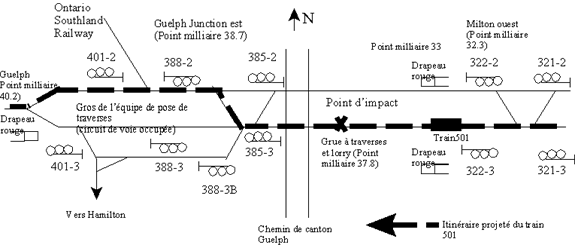 Le CCF s'est rappelé que le train 501 devait rouler en direction ouest sur la voie principale sud, pénétrer au point milliaire 33 dans la zone protégée par la règle 42, passer par les aiguillages de liaison de Guelph Junction est, au point milliaire 38,7, passer sur la voie principale nord et continuer sa route en direction ouest dans le reste de la zone protégée du contremaître.