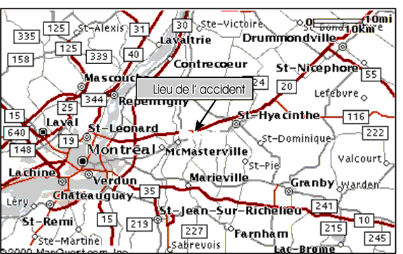Le 30 décembre 1999, le train no U-783-21-30 (train 783) du Canadien National (CN) roule sur la voie nord de la subdivision Saint-Hyacinthe en direction ouest. Le train no M-306-31-30 (train 306) du CN circule en sens inverse sur la voie sud. Vers 19 h, heure normale de l'Est (HNE)Note de bas de page 1, après avoir franchi le passage à niveau du chemin Benoît, au point milliaire 50,84, dans la ville de Mont-Saint-Hilaire (Québec) (voir la figure 1), les locomotives du train 783 croisent les locomotives du train 306. Immédiatement après, les freins d'urgence du train 783 se déclenchent et le mécanicien voit une boule de feu vers l'arrière de son train — il s'agit d'une explosion. Le chef de train lance immédiatement un premier appel d'urgence sur la radio. Après que le train est immobilisé, les membres de l'équipe du train 783 essaient en vain de communiquer avec l'équipe du train 306.