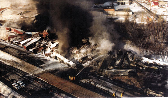Les wagons sont pêle-mêle sur les deux voies ferrées et dans les fossés des deux côtés des voies (voir la figure 2). Les locomotives du train 306 sont enveloppées par les flammes et reposent du côté sud de la voie, dans le fossé entre les voies ferrées et le boulevard Laurier (route 116). Les wagons-citernes chargés d'hydrocarbures du train 783 sont éventrés, et presque tout le matériel roulant se trouvant dans le secteur du déraillement est en feu. L'incendie est isolé et maîtrisé dans la nuit du 30 au 31 décembre, mais continue pendant quatre jours.