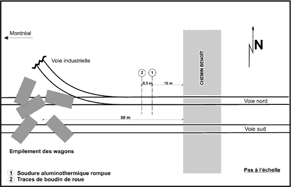 Le rail sud de la voie nord s'est rompu à la hauteur d'une soudure aluminothermique située 10 m à l'ouest de l'extrémité du passage à niveau et 1,5 m à l'est de la pointe de l'aiguille du branchement de la voie industrielle (voir la figure 3).