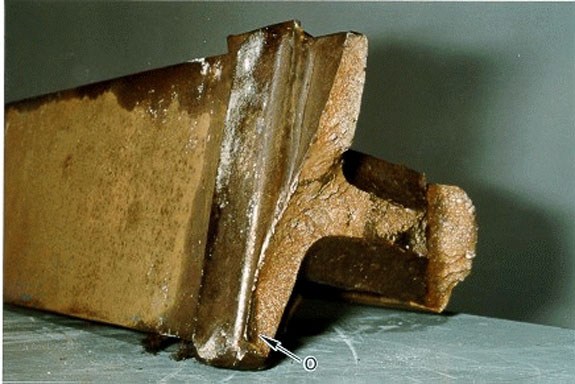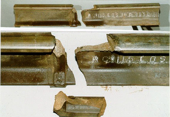 Les deux surfaces de contact de la préfissure ont été découpées dans les sections de rail est et ouest. L'analyse de ces bouts de rail au microscope électronique à balayage et au microscope métallographique a confirmé que la préfissure avait pris naissance dans une zone de ferrite aciculaire, en l'occurrence une microstructure ayant une faible résistance à la rupture et aux chocs, et qu'il n'y avait pas eu d'agrandissement récent de la préfissure.