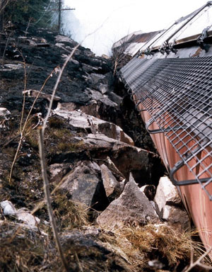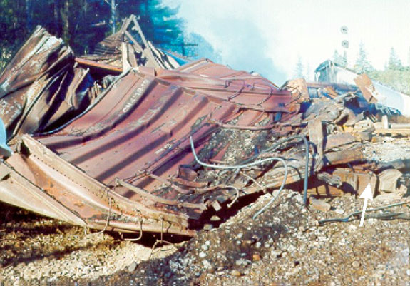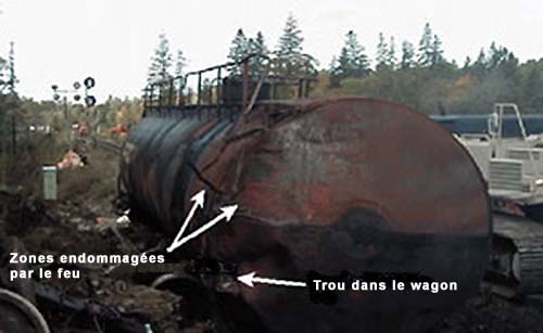 Le feu de GPL et la rupture violente de la citerne qui a suivi ont creusé dans l'emprise un cratère mesurant environ 2 m de profondeur, 3 m de largeur et 15 m de longueur, et ont détruit la plate-forme de la voie et altéré le sol et les autres matériaux voisins. Un wagon couvert qui se trouvait immédiatement à l'ouest de la citerne de GPL a été écrasé et tordu à 90 degrés. La voie principale et la voie d'évitement adjacente ont été repoussées latéralement et ont été détruites. Des débris de wagons démolis se sont retrouvés un peu partout sur le lieu du déraillement. Les arbres et le sol des environs ont été noircis par le feu dans un rayon d'environ 200 pieds. Les photographies aériennes montrent l'effet que la conflagration et la fuite de produits chimiques qui a suivie ont eu sur la végétation environnante (voir la figure 3).