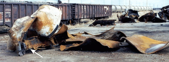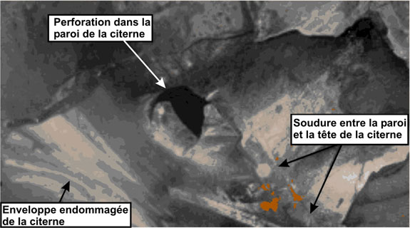 L'enveloppe du wagon d'ammoniac PROX 81179 a été fortement noircie par le feu. À l'exception d'une quantité résiduelle (fond de réservoir) de produit réfrigéré, le wagon a perdu la plus grande partie de son contenu dans les huit heures qui ont suivi le déraillement. La plus grande partie de l'ammoniac s'est consumée plutôt que de former un nuage de gaz. Les figures 4, 5 et 6 montrent une partie des dommages causés par le feu à l'extérieur de la citerne ainsi que le givre formé par le fond de réservoir de produit réfrigéré. Douze heures après le déraillement, il restait environ 10 pouces de produit dans le wagon-citerne, comme le montre la ligne de givre. Le givrage était plus prononcé près des berces de citerne du wagon, étant donné que la conductibilité thermique est plus grande dans cette zone.