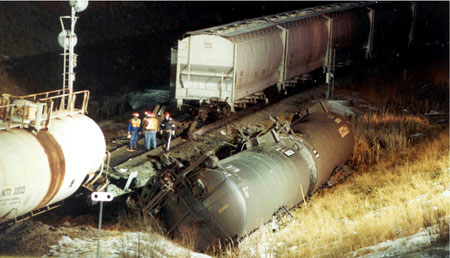 Le 2 février 2001 vers 20 h 23, on préparait le train no CP 966-02 du Chemin de fer Canadien Pacifique en vue de son départ du triage Red Deer. Au cours des préparatifs, le train roulait vers le sud à une vitesse d'environ 3,9 mi/h quand un freinage d'urgence s'est déclenché, causant l'immobilisation du train. Cinq wagons-citernes chargés d'ammoniac anhydre avaient déraillé au point milliaire 95,4 de la subdivision Red Deer. Deux des wagons-citernes déraillés se sont renversés, et 71,74 tonnes (le chargement complet) d'ammoniac anhydre se sont échappées d'un des wagons renversés. En raison du déversement, il a fallu faire évacuer les habitants du secteur ainsi que les occupants des commerces voisins, soit quelque 1 300 personnes. Trente-quatre personnes ont été admises à l'hôpital de Red Deer, où elles ont reçu des traitements appropriés au niveau d'exposition, après quoi elles ont pu quitter l'hôpital. Une personne a perdu la vie après avoir été intoxiquée par des vapeurs d'ammoniac anhydre pendant qu'elle traversait l'emprise du chemin de fer.