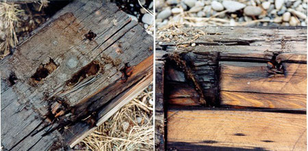 La voie de triage a été construite en 1991. À cet endroit, la voie était constituée de rails de 115 livres en différentes longueurs, fabriqués en 1986 par Algoma. Les rails étaient reliés entre eux par des éclisses à 6 boulons. La couche supérieure de plate-forme, le ballast et les dispositifs de fixation étaient en bon état. Une inspection des traverses faite après le déraillement a révélé un jeu latéral d'environ deux pouces et demi dans le trou de crampon et la selle de rail, à l'endroit où le déraillement a eu lieu. Des déformations dans les trous de crampon indiquaient que les traverses étaient détériorées et qu'elles ne pouvaient plus maintenir l'écartement des rails. La figure 4 montre le jeu latéral dans les trous de crampon.