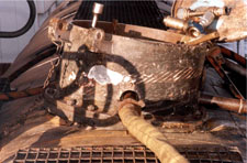 Le rapport no LP 009/2001 du Laboratoire technique du BST indique que la buse du trou d'homme du wagon-citerne PROX 88421 a été soumise à une surcharge considérable au moment du déraillement et du renversement du wagon et qu'elle a alors subi une rupture fragile qui a laissé une ouverture d'environ 5,125 pouces carrés dans la zone affectée thermiquement de la soudure entre la buse du trou d'homme et les parois de la citerne (figure 7). Le wagon a aussi subi une rupture par cisaillement du métal près de la longrine; cette rupture a été attribuée à une petite précrique localisée dans la soudure entre la longrine et la plaque, du côté extérieur de la longrine. Vu que l'ammoniac s'est répandu graduellement dans l'atmosphère, il ne s'est pas formé de gros nuage de gaz au moment de l'accident. De l'ammoniac liquide s'échappait encore lentement du wagon, 24 heures après l'accident.